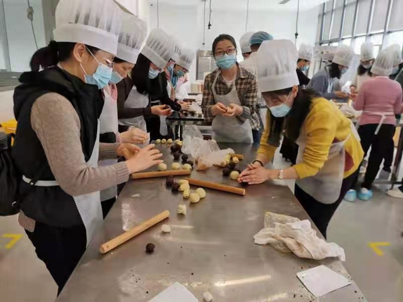 烘焙DIY体验更是让“女神们”过了一把“烘焙大师”的瘾。从馅料的准备,包裹造型,到烘焙时的漫长等待,在烘焙师傅的带领下,老师们认真学习,一丝不苟,待到奶香十足的蛋黄酥出炉的那一刻,大家都露出了满意的笑容。
