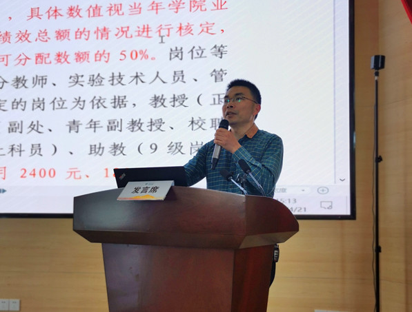 学院工会主席葛深渭代表学院工会作工作报告。学院党委副书记、纪委书记方海明作《学院奖励性绩效工资分配办法》调整说明。