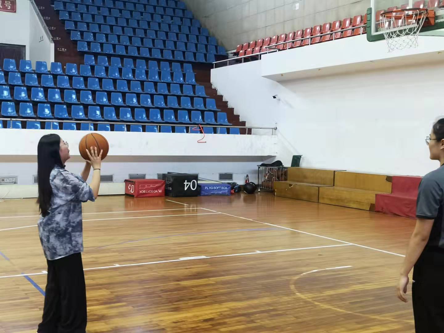 中场休息,严群英、刘斌红老师以及场下观战的12名女生,分成两组参与了女子投篮比赛,投中的球数分别计入老师队和学生队的比分中。