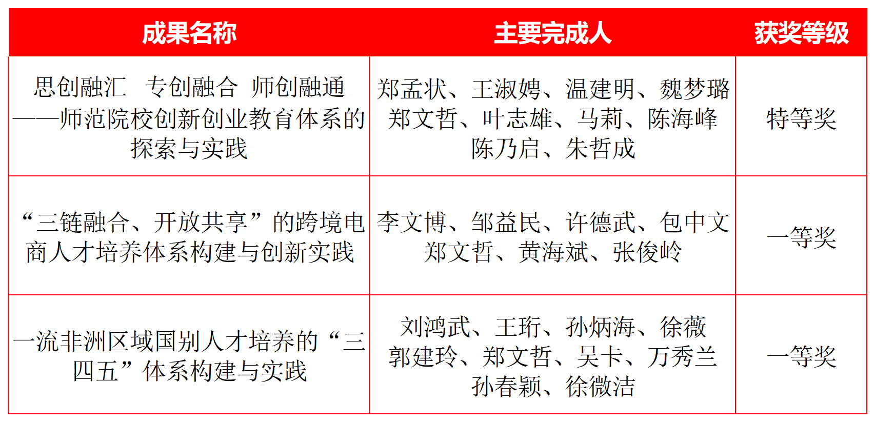12月23日,2021年浙江省教学成果奖推荐名单公示,我院副院长李文博、院长助理邹益民主持完成的《“三链融合、开放共享”的跨境电商人才培养体系构建与创新实践》成果荣获省级教学成果一等奖。我院党委书记郑文哲参与完成的《思创融汇 专创融合 师创融通——师范院校创新创业教育体系的探索与实践》及《一流非洲区域国别人才培养的“三四五”体系构建与实践》成果分别荣获省级教学成果特等奖、省级教学成果一等奖。