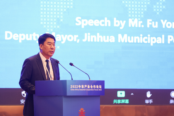 付永久代表金华市政府向出席本次活动的各位领导、国内外嘉宾和企业家朋友们表示热烈欢迎。付永久指出,2018年起,金华市政府与浙师大携手连续举办中非文化合作交流周暨中非经贸论坛活动,经过多年努力,论坛层次越来越高,从地方会议升格为国家级论坛;参与面越来越广,涉及国内外政府、企业、高校、智库、媒体;内容越来越丰富,今年的论坛由28项活动组成。论坛已成为我市、浙江省乃至全国对非交往的重要平台之一。中非产业合作论坛作为中非经贸论坛的重要分论坛之一,将围绕中非产业合作发展的机遇与挑战进行研讨,助推中非产业的深度对接。付永久希望各方持续巩固经贸成果,共享“一带一路”、中国(浙江)自贸区金义片区建设等重大机遇,大力发展跨境电商,创新易货贸易模式,做强大宗商品贸易,打造中非合作的标杆典范。希望我们努力开拓合作领域,围绕医疗科技、影视文化等方面,开展全方位、多领域、深层次的战略合作,形成更多特色成果。