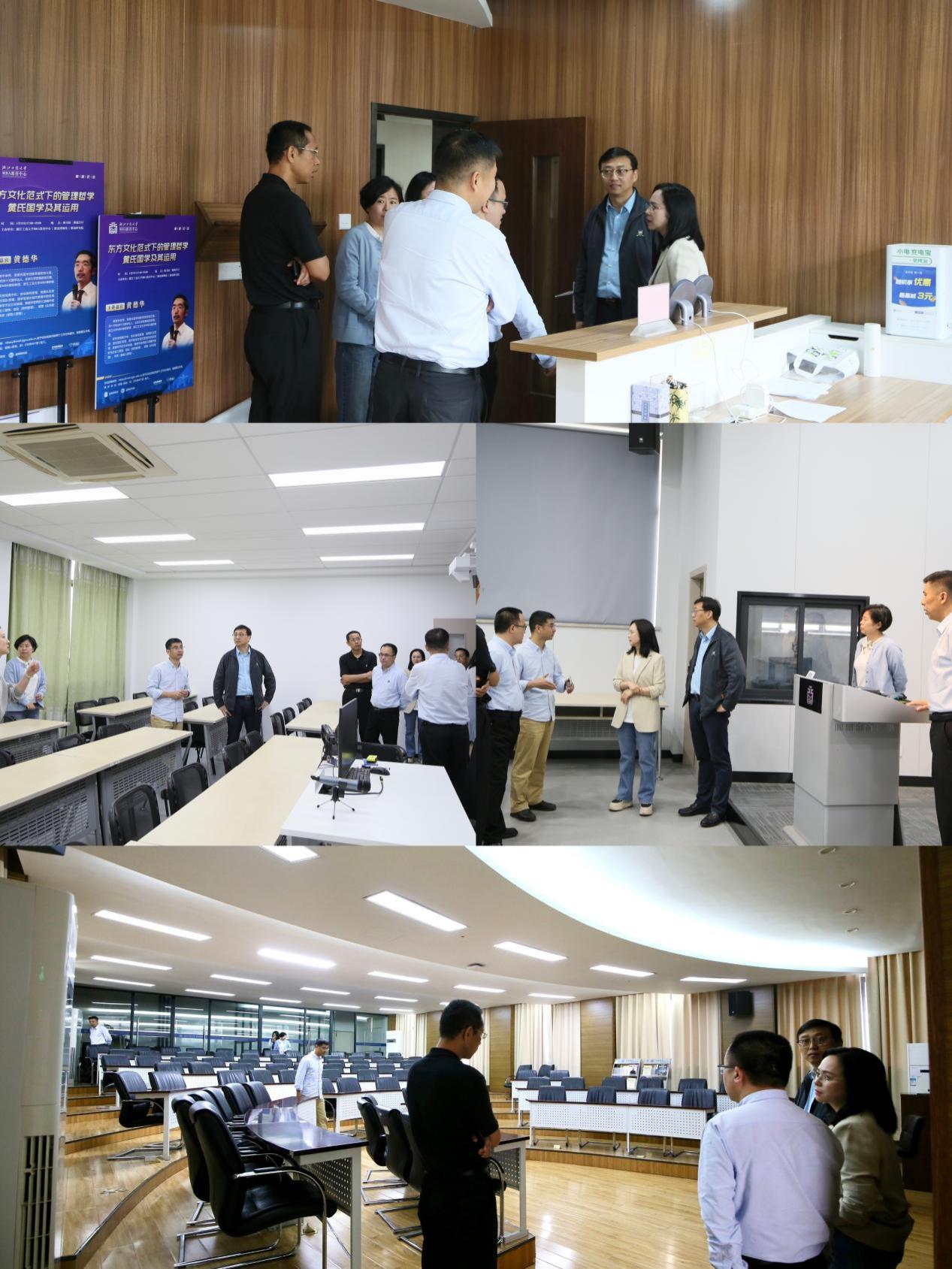 首先,在肖主任的带领下,郑院长一行参观了智慧教室、案例研讨室等教学设施。并在现场交流了教学设施的使用与课堂教学组织等情况。