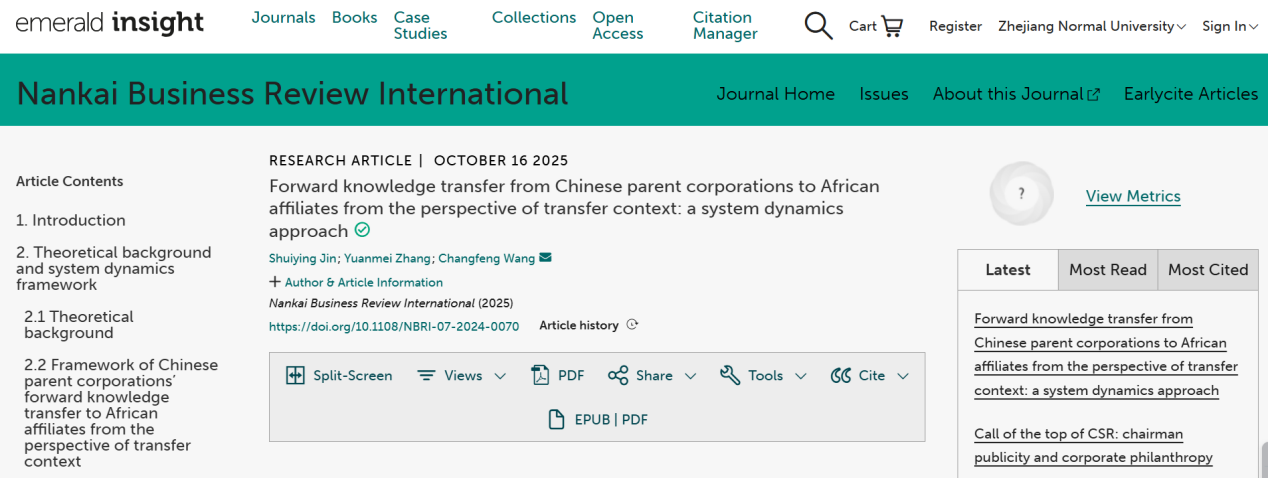 近日,我院教授金水英(一作)和王长峰(通讯作者)在Nankai Business Review International(《南开管理评论》英文版) 2025年10月14日在线发表题为“Forward Knowledge Transfer from Chinese Parent Corporations to African Affiliates from The Perspective of Transfer Context: A System Dynamics Approach”的论文。