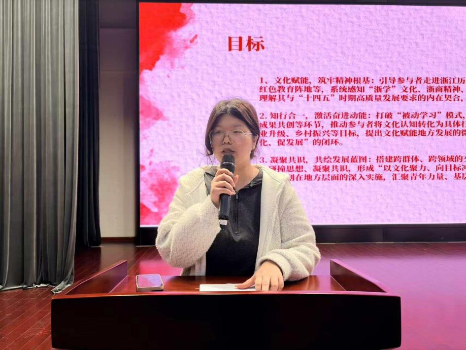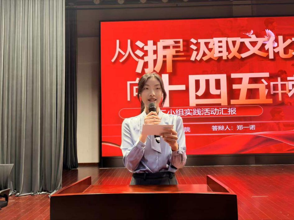 金华校区三个实践小组则在聚焦文化与政策的基础上,更突出“文化与个人发展、专业能力、团队协作”的结合。各小组从活动设计、流程、意义或成果等角度展开汇报,核心亮点显著:有的引导学生将浙江文化精神与专业能力相融合,避免个人发展与时代脱节;有的通过观看文化片段、政策解读视频,聚焦科技创新、乡村振兴等关键议题,推动成员开展故事创作与深入研讨,并形成完整的实践报告与成果汇编;有的则在阐述文化内涵与活动目标的同时,强调实践活动对团队协作力量的凝聚及青年担当的践行。