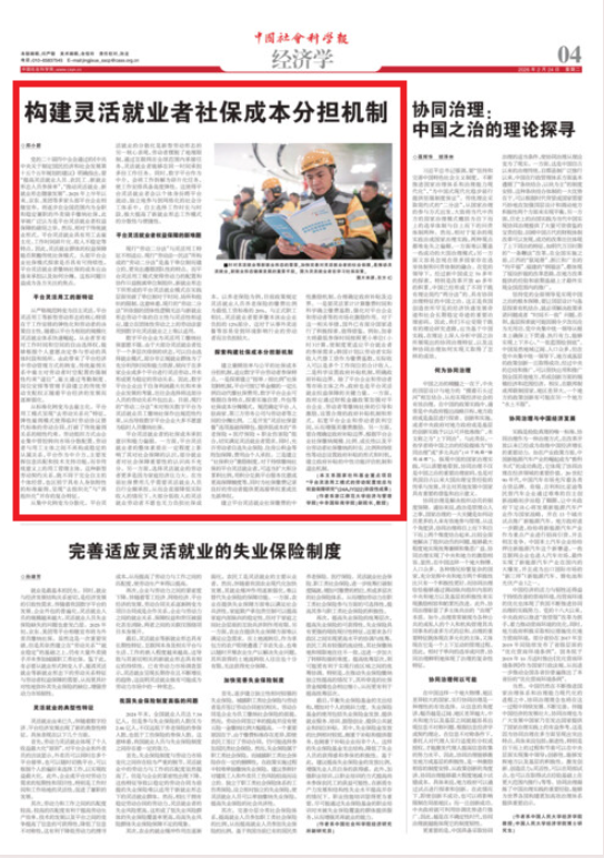 2026年2月24日,我院郑小碧教授在《中国社会科学报》上发表文章《构建灵活就业者社保成本分担机制》,该文系国家社会科学基金重点项目“平台灵活用工模式的劳动配置效应与权益保障研究”(24AJY022)的阶段性研究成果。